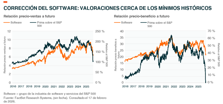 Creemos que el impacto de la IA en el software es más específico que generalizado, con la presión concentrada en los modelos que dependen de las suscripciones de usuarios en lugar de abarcar todo el sector. Las decisiones de compra de las empresas siguen estando condicionadas por los costos de cambio, la complejidad de la implementación y los retos de la integración de datos. Las plataformas que integran la IA directamente en los flujos de trabajo, la conectan a los datos empresariales y gestionan la gobernanza y la seguridad se posicionan de forma diferente a las herramientas más reemplazables. En este entorno, una exposición amplia al sector puede pasar por alto ese matiz.