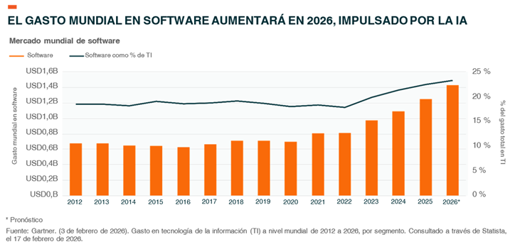 Dejando a un lado la reciente volatilidad, las partidas presupuestarias de las empresas cuentan una historia diferente. A nivel mundial, se espera que el gasto en TI alcance los 6 billones de USD, de los cuales el software representa casi 1,43 billones de USD, lo que supone un aumento del 14,7 % interanual. Esto sitúa al software en algo más del 23 % del gasto total en TI, y sigue siendo una de las principales categorías con más rápido crecimiento.6 Lo que constituye un dato aún más revelador es que el gasto en modelos de IA generativa sigue suponiendo un crecimiento de ~80,8 % en 2026, lo que significa que el software relacionado con la IA se está expandiendo rápidamente incluso mientras el mercado debate el riesgo de disrupción.7