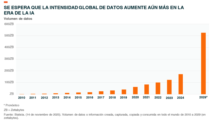 En tercer lugar, el trabajo del software siempre ha sido traducir la creciente intensidad de los datos en algo operativo: sistemas que almacenan, protegen, mueven e interpretan la información. Ese motor subyacente no se está ralentizando. Se espera que los datos globales creados, consumidos y almacenados aumenten un 254 %, pasando de ~149 zettabytes en 2024 a ~527 zettabytes en 2029.9 Ese aumento refleja la enorme intensidad de datos de la IA. Si esa trayectoria es direccionalmente correcta, es poco probable que el gasto en software se comprima mientras eso sucede.